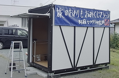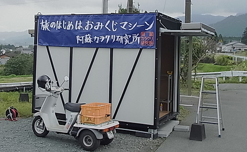 阿蘇カラクリ研究所は2019年10月1日で12周年を迎えました。 「干支が一周!やったー!すごい!よく潰れなかった!」 それを記念して無人展示場を作ってます。場所は旧Yショップさかたの駐車場で南郷谷の入口です。 ちょうどYショップさかたの跡継ぎチョコボール姉さんも「コンビニやめてヒライっぽい業態(弁当中心の物販)にしたい」との事だったので「どうせ借金するなら一緒にやろう」て流れの第二創業です。 で、このページは計画の進捗を載せます。たまに見て頂き、一緒に立ち上げた気分になって一緒にどんちゃんやりましょう。 〜はじまりは2017年の春〜 チョコボール姉さんから業態変更の話を聞く。「改造に併せて立ち呑みボックスを作ろう」と盛り上がるも進展なし。 〜その次は2018年の春〜 コンビニ隣の部屋が空いたからイートインスペースを作るという話を聞く。「今度こそ」って待ったけど進展なし。 〜やっと動いた!2019年7月〜 Yショップの看板が急に茶色で塗り潰された。フランチャイズの契約を解除したらしい。 〜また停滞!2019年8月〜 じゃんじゃん進むと思いきや進む様子がないので話を聞くと「誰かが尻を押さねば進まない」との事。尻を押すべく、まずは僕が借金し、中に入れるモノを作り、プレハブを注文した。 〜今度こそ!2019年9月〜 「色々買ったからもう引き下がれない」と告げた。やっと火が点いて掃除が始まった。Yショップさかた改造計画、及び、アソカラ無人展示場計画スタート。 〜以下、進捗報告〜 2019年9月25日 プレハブが来た。身の丈に合わせて1.6坪。みんな「犬小屋みたいな展示場だね」とは言わず「かわいい展示場だね」と言ってくれた。 2019年9月26日 Yショップさかたの新屋号が決まった。「さかたや」だそう。 2019年9月27日 チョコボール姉さんがまた動かなくなると困るのでこのページを作った。 2019年9月29日 台風が来ると言うのでプレハブの四隅を地面に打ち付けた。 2019年10月2日 展示用のフレームを組んで床に固定した。 地元の大通りで作業してると次から次に話しかけられるけど、みんな手伝う気はないという事を知った。 2019年10月7日 旧Yショップさかたの地元民用休憩場が「さかたやイートインスペース」になって少し綺麗になったそう。どう変わったのかよく分からないけど「よく見たら変わってるでしょ」って言われた。 2019年10月7日 プレハブにひさしを付け、左右の壁に横断幕を張った。「手書きの方が味がある」と言われたけど、それは字の上手い人の話だと知った。 2019年10月9日 チョコボール姉さんから「はい!うちのロゴ!」手書きのそれを渡されたのでポスターを作った。絶品お惣菜が並ぶそう。ちなみに景樹お母さんは本気を出した時の格好が志茂田景樹。 2019年10月10日 のれんが付いた。大人の本気だから木綿の本染め品を選択。のれんを毎日上げ下げするのが夢です。夢が一つ叶いそう。 2019年10月14日 紅白幕と説明用のホワイトボード、それに踏み絵ステップを設置。「人は大事なモノを決して踏まない」と隠れキリシタンに教わったのでウチのロゴをステップに付けた。なんと100%踏まれた。 とりあえずコレでアソカラ展示場は遊んで頂く環境が整いましたので10月17日から不定期オープン致します。 尚、豪雨の日と強風の日と僕が不在もしくは多忙な日は休みます。つまり、なかなかの確率で休みなので、行こうと思われた方は出発前にこちらのページで今日の予定をご確認下さい。通りがかりの方はのれんが出てたらやってます。どうぞお立ち寄り下さい。 2019年11月20日 知り合いに「道端のノボリが邪魔でおみくじ小屋に気付かない」と言われたのでノボリを屋根に上げた。 2019年11月26日 「カラクリ研究所なのにロボットがない」「なんか普通だ」と子連れの家族に言われたので人型看板を屋根に乗せた。 トップページに戻る |